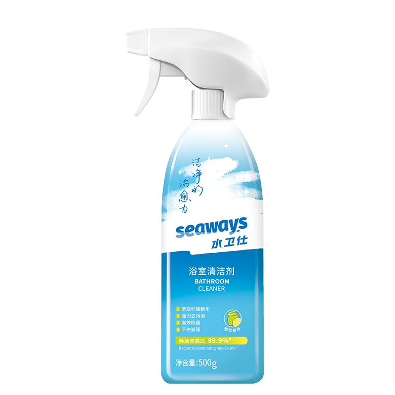 Powerful descaling and high-efficiency sterilization. It can remove 99.9% of bacteria from bathroom porcelain surface, sink, glass, soap scale, etc. Extracts of lemon essence, it is mild and no skin stimulation.
